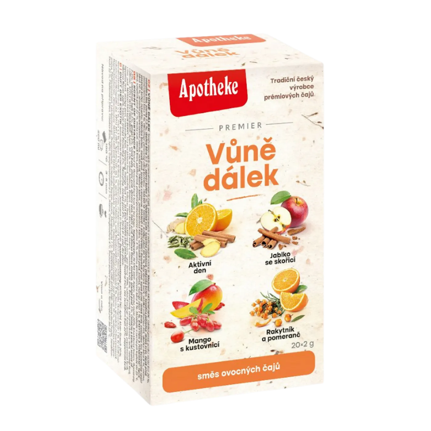 Apotheke Vůně dálek přináší pestrou kolekci ovocných čajů v praktických nálevových sáčcích. Každý šálek nabídne jiný chuťový zážitek – ideální pro chvíle pohody i drobnou změnu během dne. Čaje jsou vhodné jak pro horkou přípravu v chladnějších dnech, tak i jako osvěžující studený nápoj.