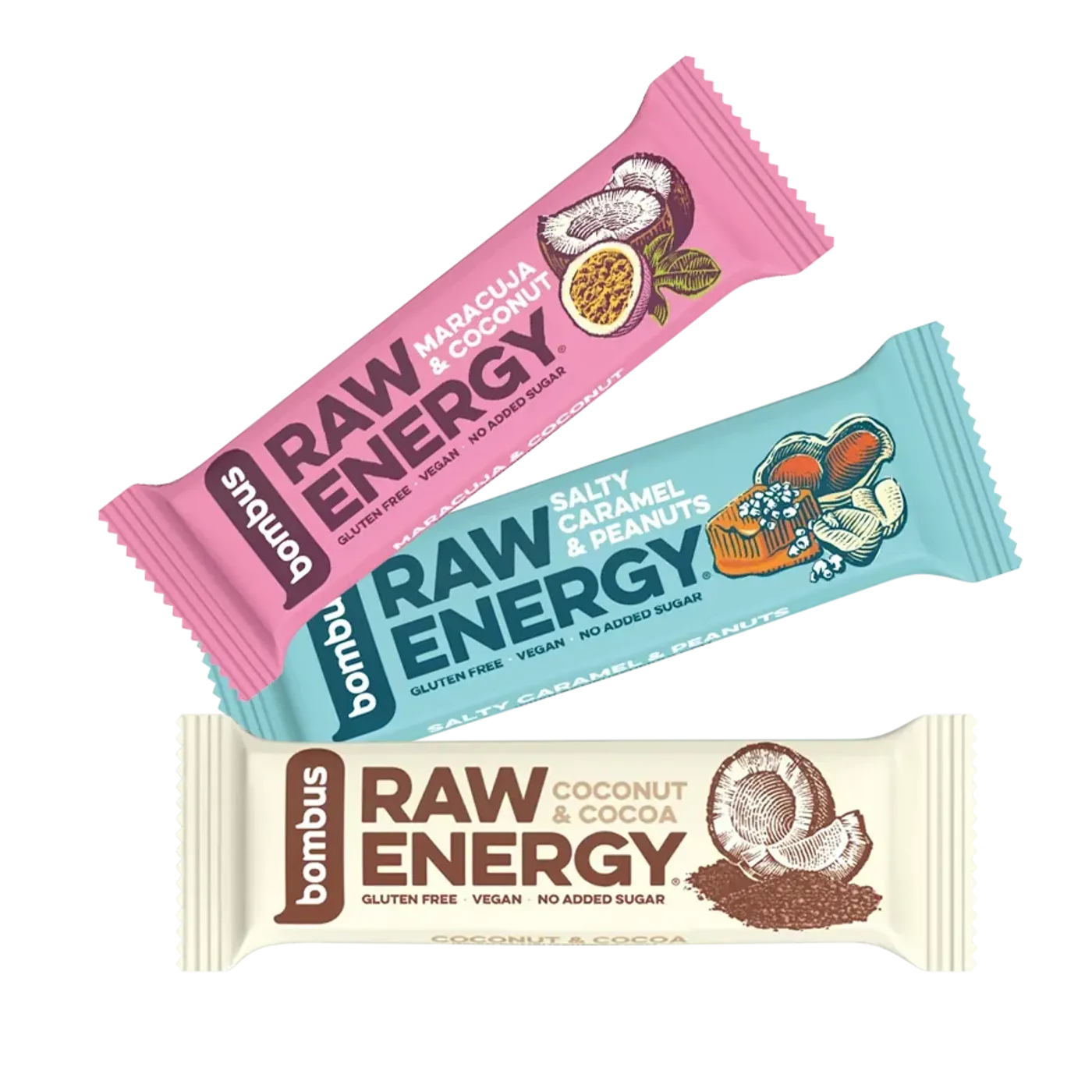 Balení obsahuje tyčinky: 1x Bombus Raw Energy Coconut & Cocoa 50g 1x Bombus Raw Energy Maracuja & Coconut 50g 1x Bombus Raw Energy Salty Caramel & Peanuts 50g