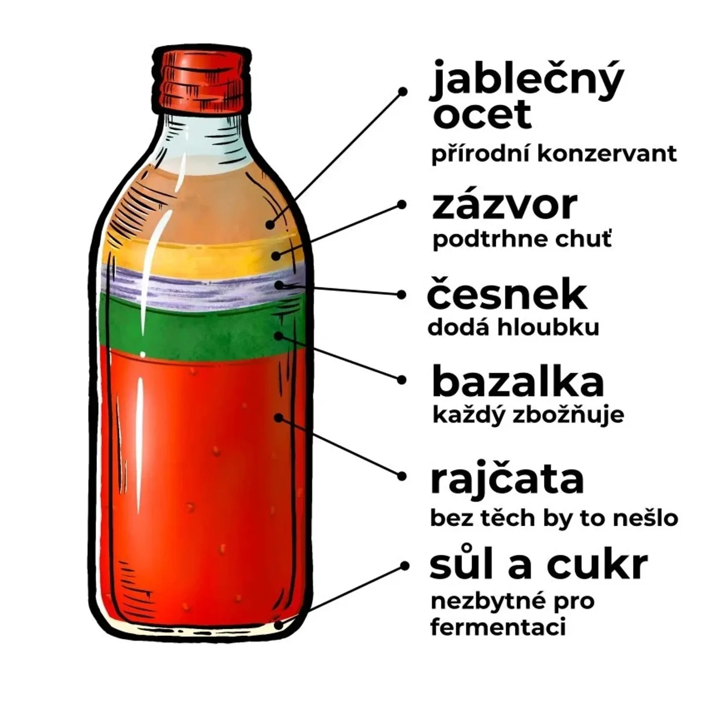 Rajčata, jablečný ocet, cukr, sůl, zázvor, česnek, bazalka.