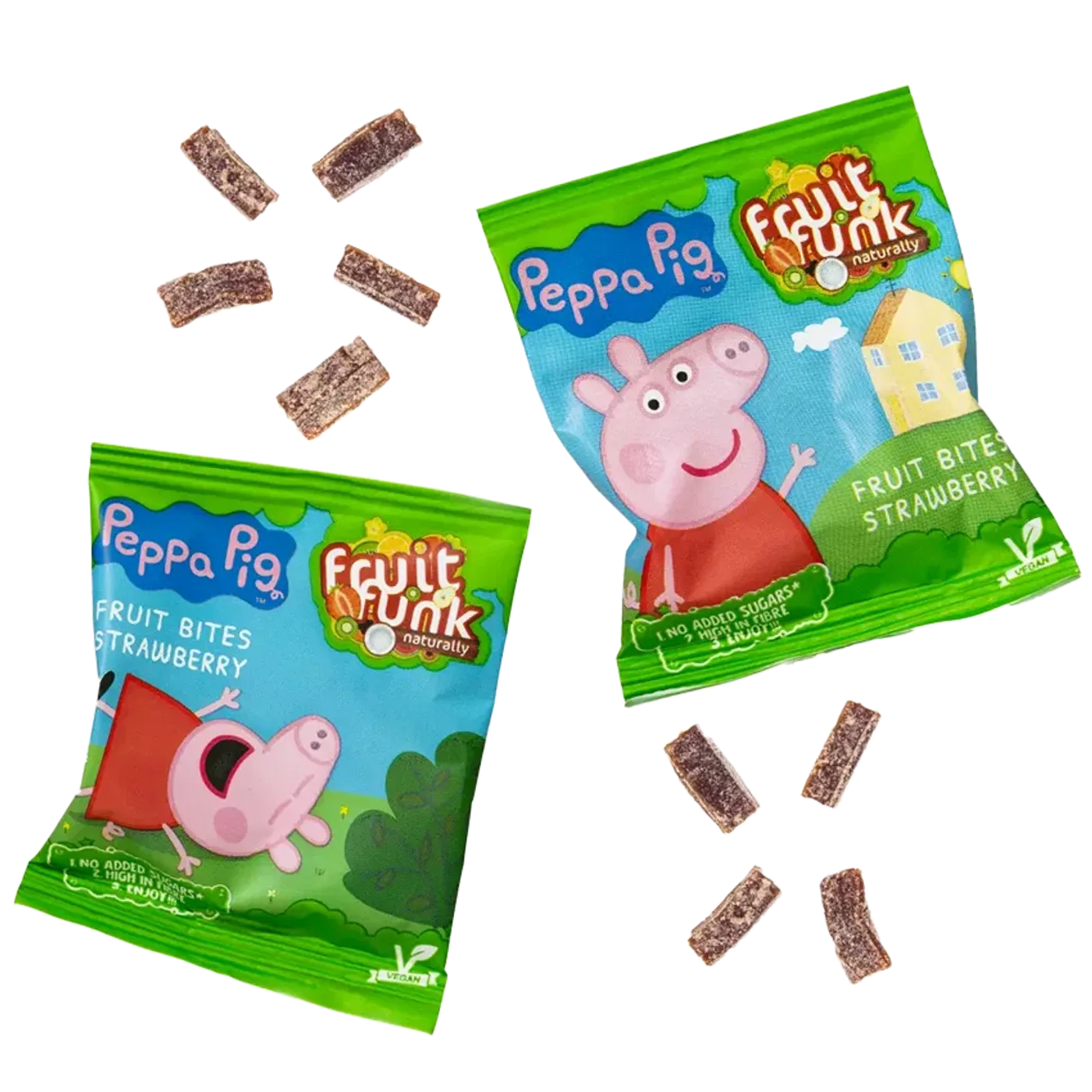 Skvělá svačinka pro děti v podobě ovocných jahodových kousků ocení milovnice a milovníci prasátka Peppy.