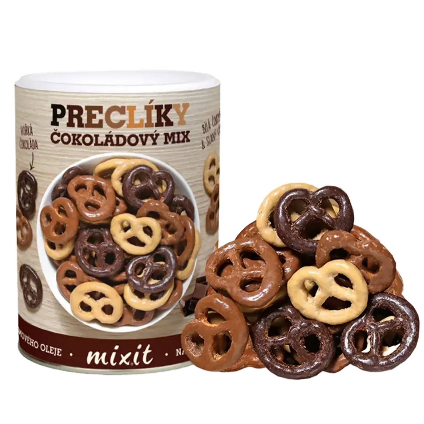 Tři preclíky jdou, do mixu za sebou! Nejdřív si ale dají čokoládovou koupel. Pro vypečené Mixit preclíky jsme vybrali lázeň z mléčné a hořké čokolády a nechyběla ani lázeň z bílé čokolády se slaným karamelem. Kdo si láme hlavu, jaký preclík zvolit, je pro něj tento čokoládový mix preclíků ten pravý