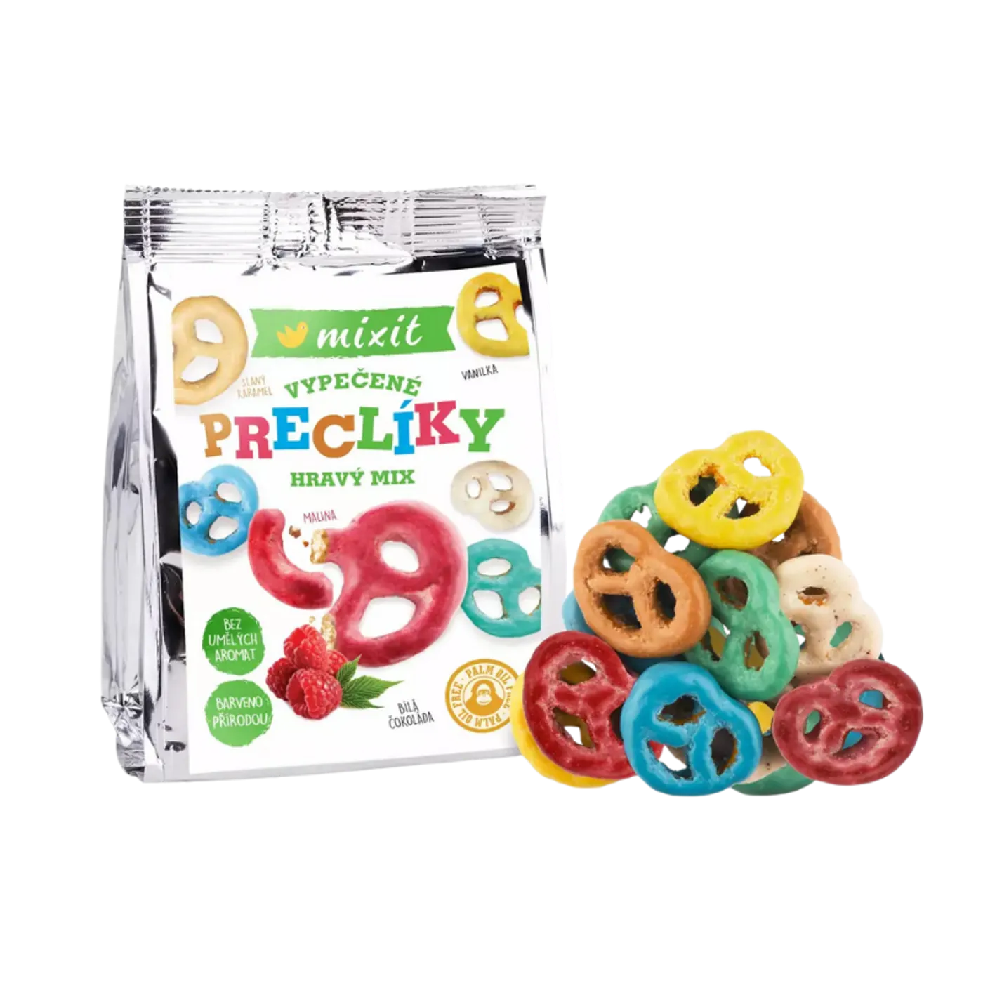 Tento hravý mix preclíků v menším kapsovém balení nabízí různé tvary preclíků obalených v bílé čokoládě, čokoládě s jogurtovou příchutí a karamelové bílé čokoládě. Barevnost je vytvořena přírodními barvivy ze spiruliny a světlice barvířské, sladkost pak pochází z cukru a medu. Perfektní malá svačina nebo rychlý snack kdykoli během dne, která se vejde pohodlně do kapsy nebo tašky.
