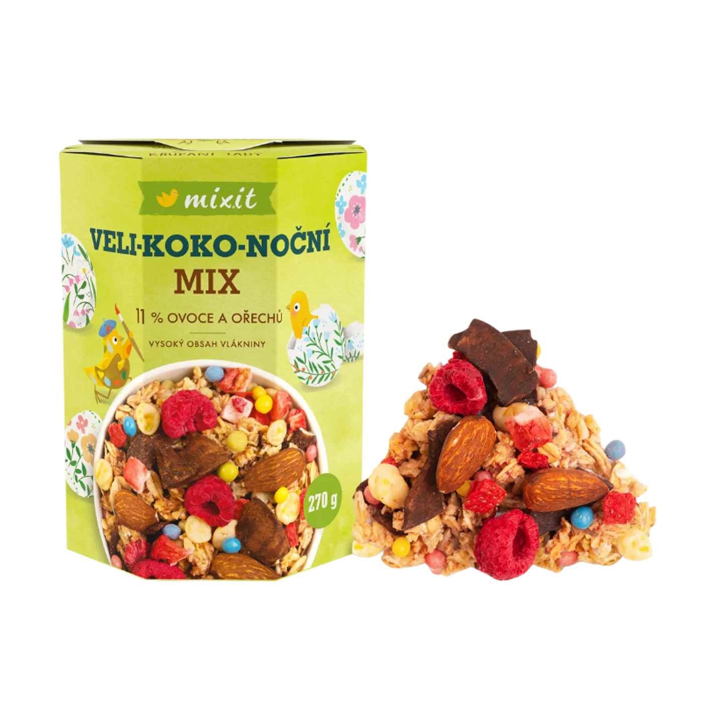 Tento velikonočně laděný mix staví na základu z celozrnné granoly, kterou doplňují kokosové plátky s kakaem, pražené mandle, lněná a slunečnicová semínka. O barevný efekt se starají mini křupinky v bílé čokoládě, barvené přírodními složkami – práškem z mrazem sušených malin, matchou, spirulinou a světlicí barvířskou. Ve směsi nechybí ani kukuřičné lupínky v bílé čokoládě a skutečné lyofilizované jahody a maliny. Výsledkem je pestrá a křupavá kombinace chutí, která se hodí ke snídani i jen tak na zobání.