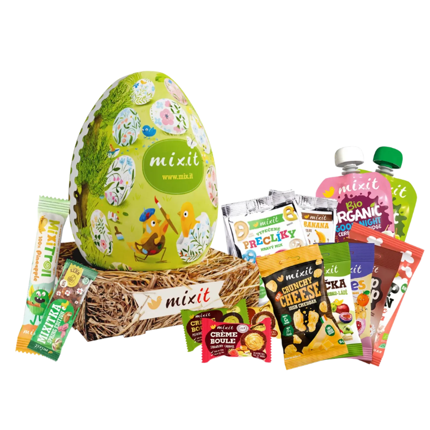 Obří ručně vyráběné vejce s hnízdem, které v sobě ukrývá 14 nejoblíbenějších Mixit dobrot a veselé velikonoční samolepky.