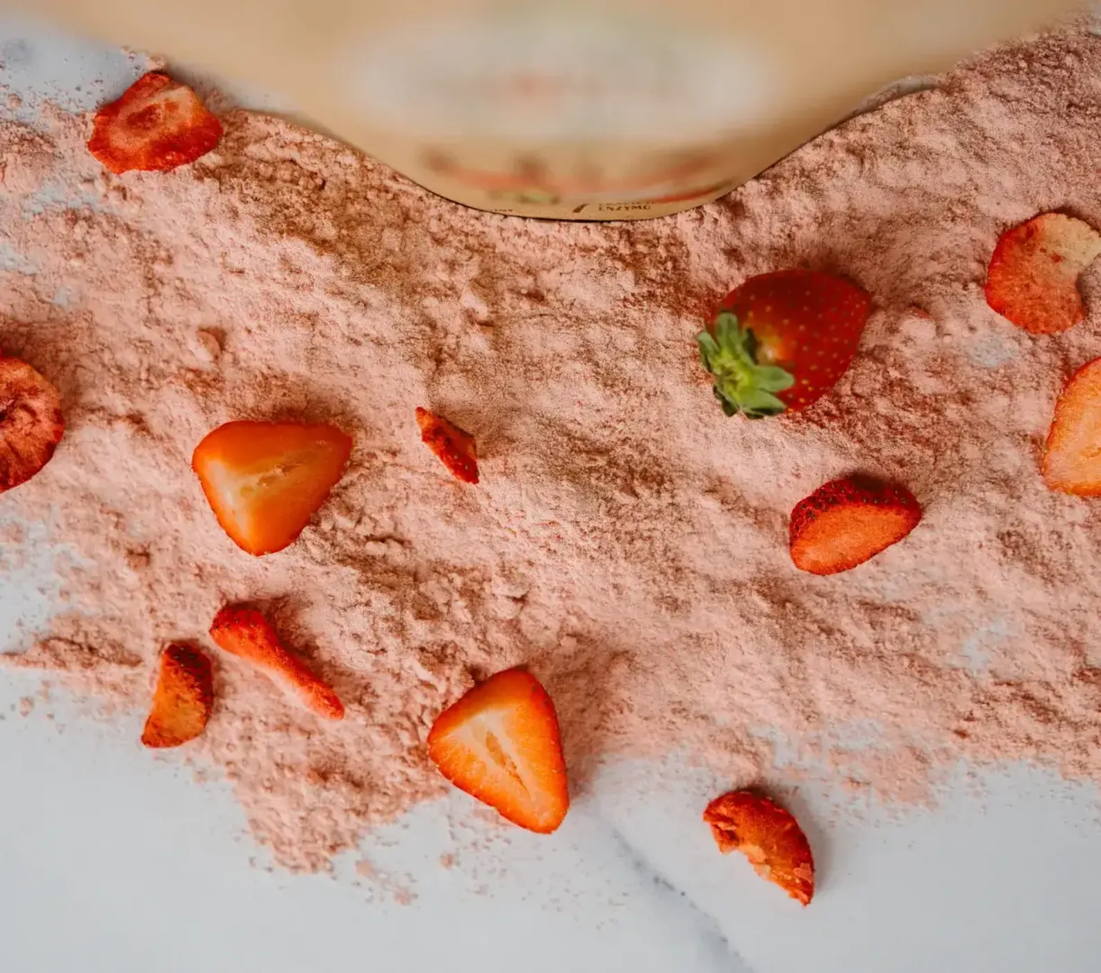 Mikrofiltrovaný syrovátkový koncentrát, mrazem sušené jahody (12 %), BCAA (L-leucin 500 mg / porce, L-isoleucin 250 mg/porce, L-valin 250 mg / porce), sušená syrovátka, trávící enzymy Opti-7-DIGEST™ (papain, alfa-amyláza, celuláza, bromelain, laktáza, neutrální proteáza, lipáza), sladidlo: steviol - glykosidy.