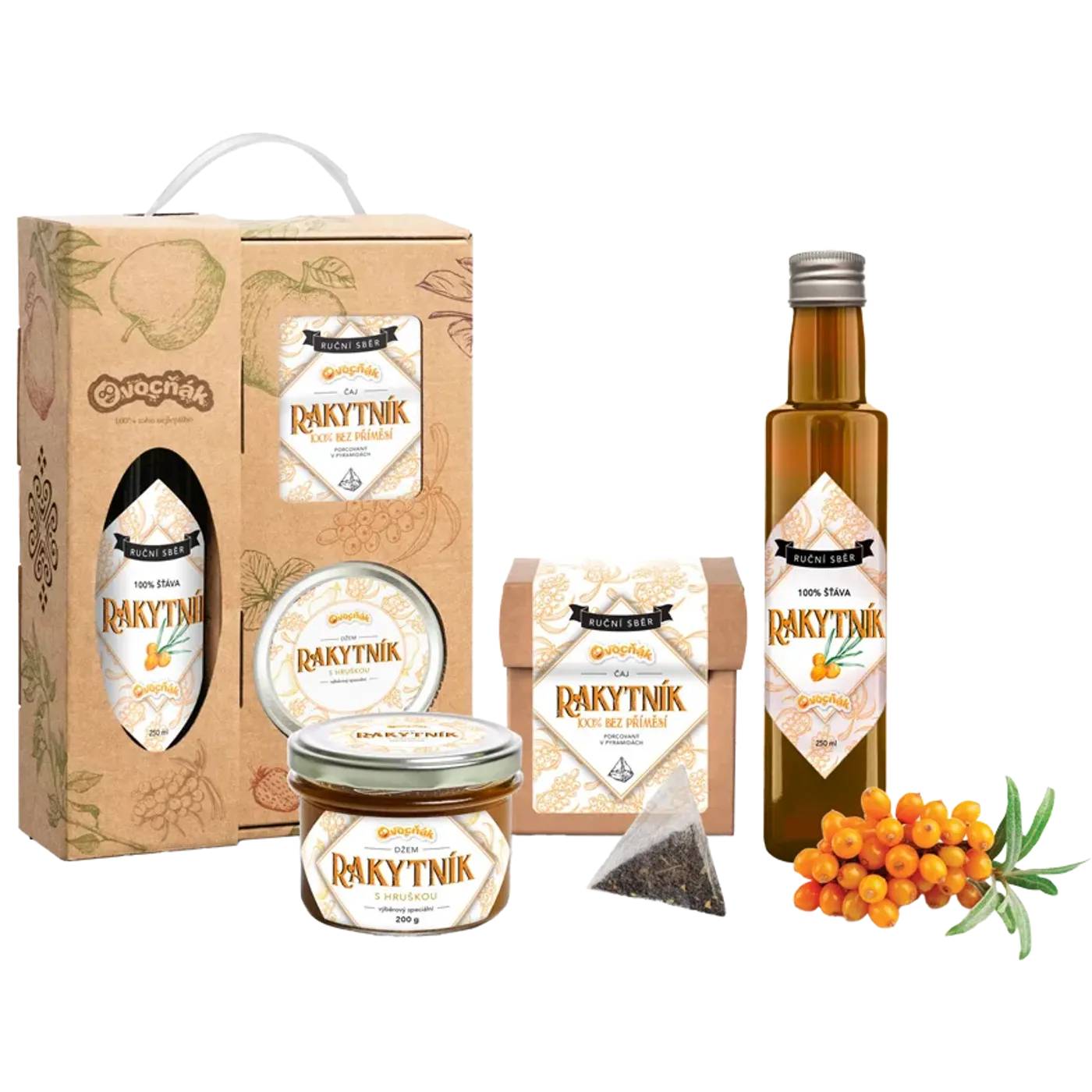 Rakytník obsahuje až 10× více vitamínu C než pomeranč – ideální podpora imunity v každém ročním období. Hotový dárek, který potěší i bez dalšího balení – elegantní, praktický a připravený k předání. Pečlivě ručně sklizený rakytník z plantáží v Beckově. Balení obsahuje 100% rakytníková šťáva 250 ml, 100% rakytníkový čaj 50 g, Rakytníkový džem s hruškou 200 g.