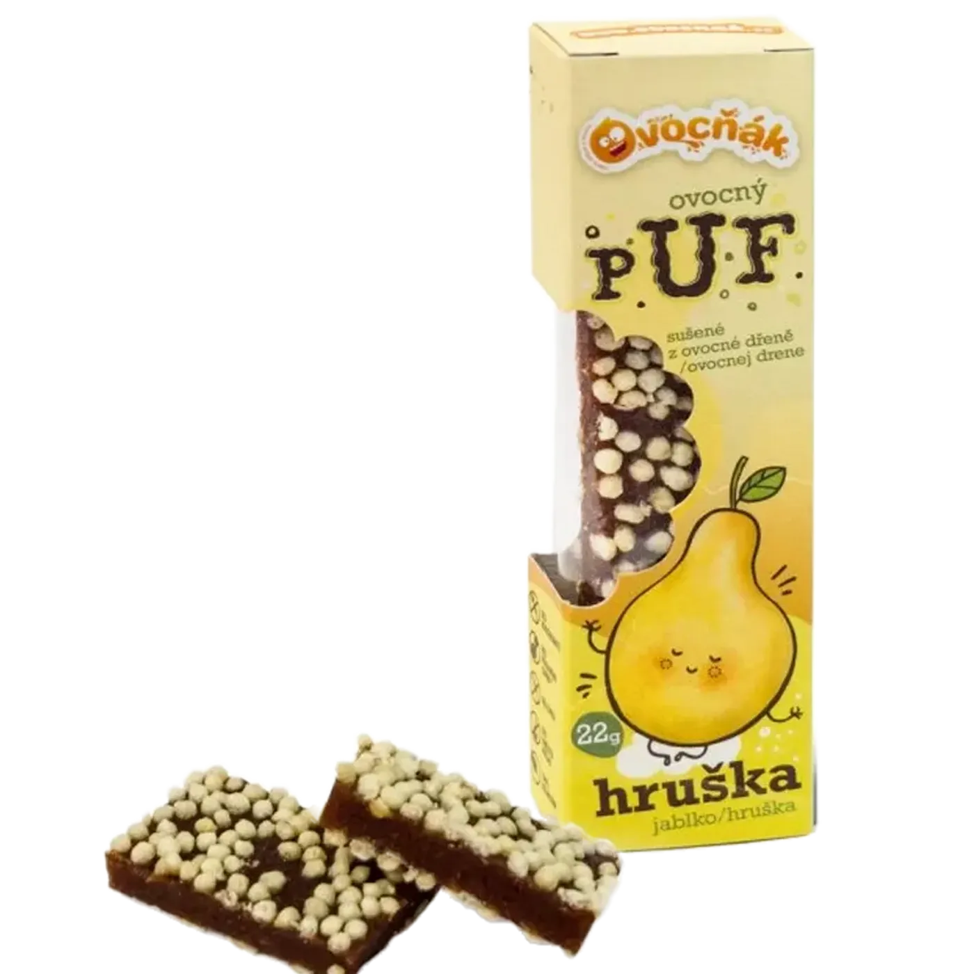 Vznikly tak, že jsme dřeň z našeho ovoce zasypali extrudovanou (pufovanou) rýží a plátky usušili společně za nízkých teplot. Díky tomu si i pufy zachovávají většinu výživných látek, které obsahuje čerstvé ovoce. Vrstva rýžových pufíků jim pak zajišťuje kromě křupavosti to, že můžete vzít snadno do ruky, protože nelepí.