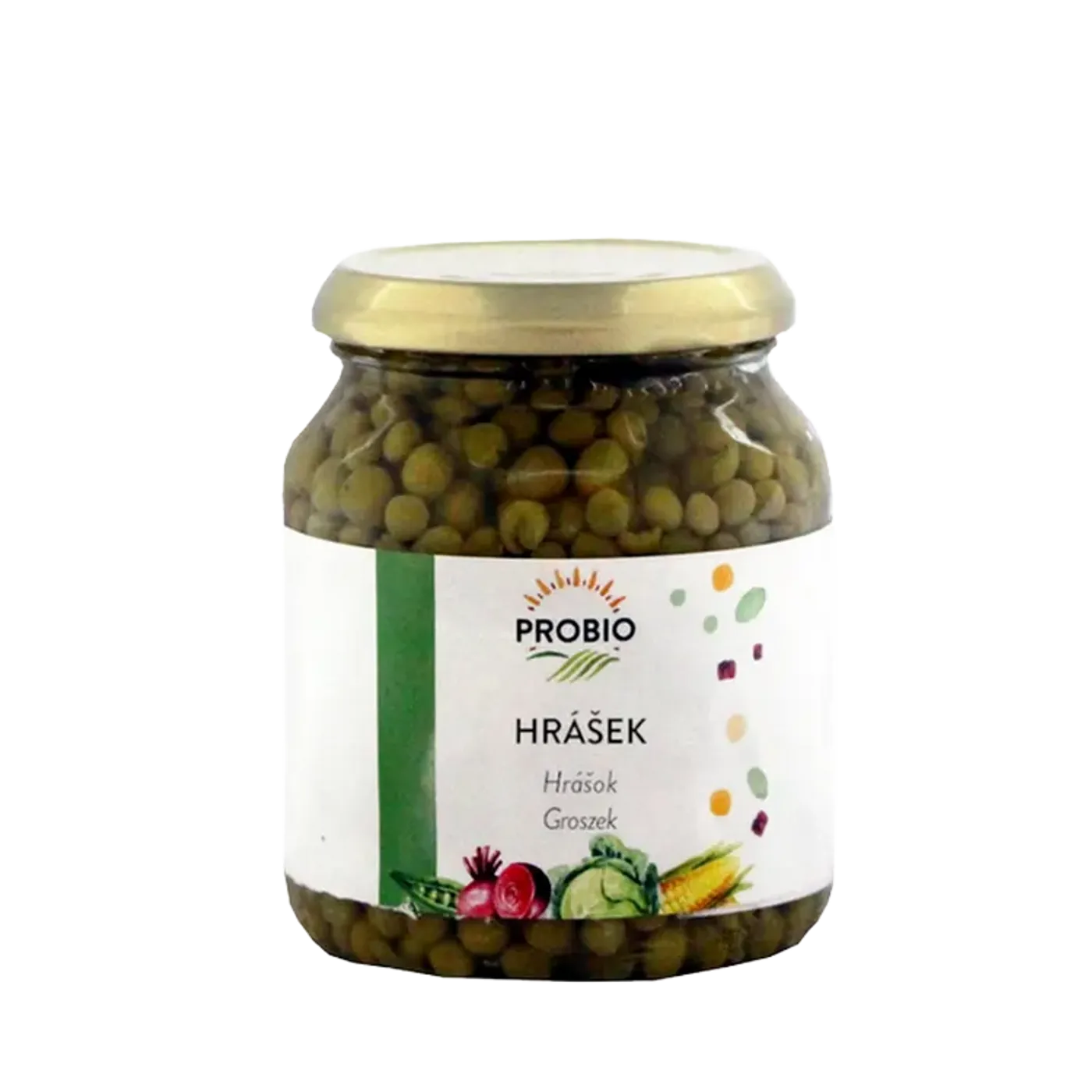 Hrášek sterilovaný ve slanosladkém nálevu.