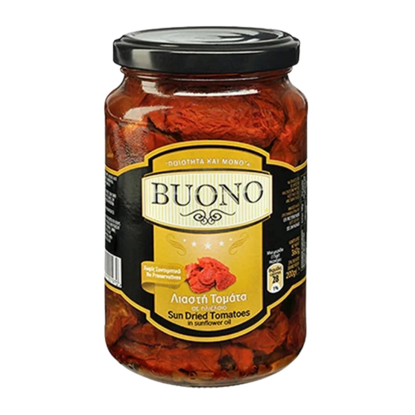 Sušená rajčata Buono jsou ručně vybíraná a sušená na slunci, aby si zachovala bohatou sladkokyselou chuť. V oleji s bylinkami a kořením jsou skvělým doplňkem salátů, těstovin, sendvičů nebo jen tak k zakousnutí. Díky 55 % podílu sušených rajčat je aroma výrazné a autentické.