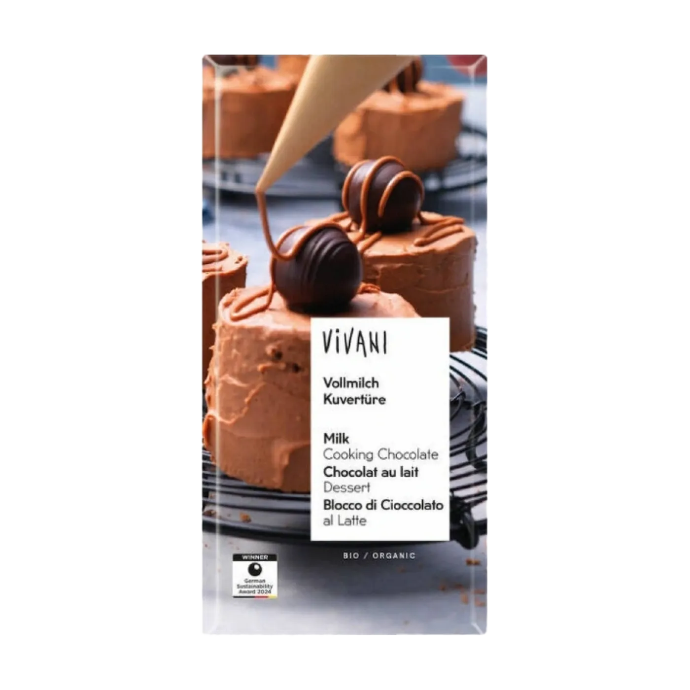 Jemná bio mléčná čokoláda od značky Vivani, speciálně vytvořená pro vaření a pečení.